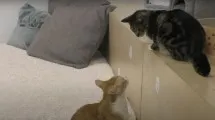 - Субъекты: Было протестировано 48 кошек (28 самцов и 19 самок). Двадцать девять (17 самцов и 12 самок, средний возраст 3,59 года, стандартное отклонение 2,71 года) жили в пяти «кошачьих кафе» (среднее количество совместно проживающих: 14,2, стандартное отклонение 10,01), где посетители могут свободно взаимодействовать с кошками. Остальные 19 (11 самцов и 8 самок, средний возраст 8,16 года, стандартное отклонение 5,16 года) были домашними кошками (среднее количество совместно проживающих: 6,37, стандартное отклонение 4,27). Мы тестировали домашних кошек, живущих как минимум с двумя другими кошками, поскольку эксперимент требовал двух кошек в качестве моделей. Кошки-модели были квазислучайным образом выбраны из кошек, живущих с испытуемым, при условии минимального периода совместного проживания в 6 месяцев и наличия различных окрасов шерсти, чтобы их морды могли быть легче идентифицированы. Мы не просили владельцев вносить какие-либо изменения в график воды или кормления.