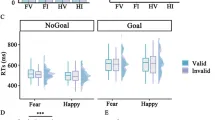 Пятифакторный ANOVA на среднее время реакции go trials revealed основной эффект Задачи, поскольку участники были быстрее в GDT, чем в EDT. Он также revealed основной эффект Эмоции, поскольку у участников было более длительное время реакции на испуганные facial expressions по сравнению с happy ones.